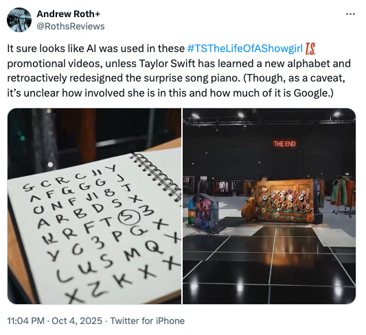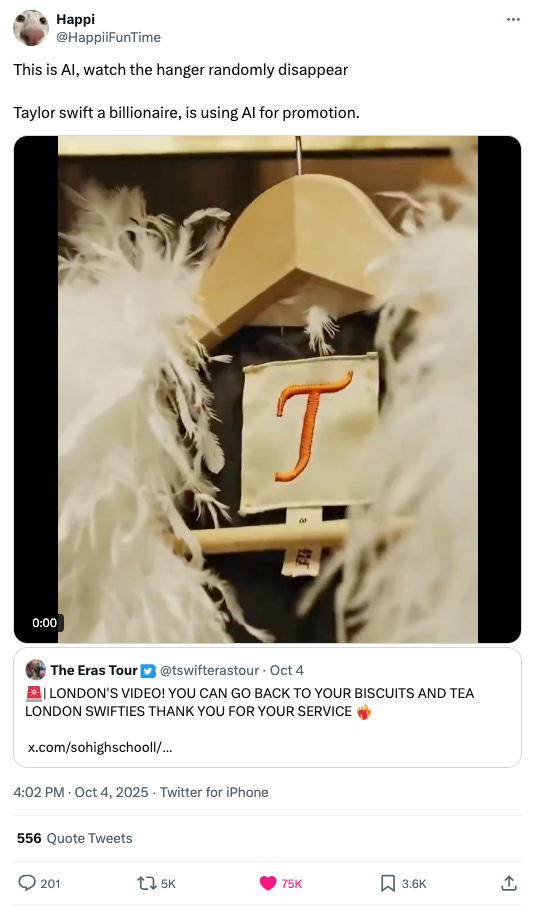 Ai content looks like total ass but, because it’s also so inconsistent, Swiftie’s struggled to tell whether the missing letters and fucked up visuals were mistakes or purposefully placed easter eggs.