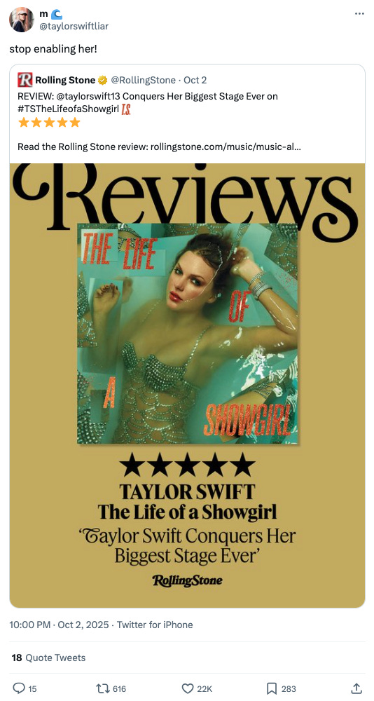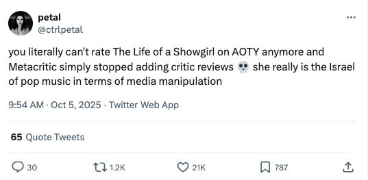 Her haters aren’t even wrong, but the breadth of the pile-on is always universal and usually a bit jarring, if I’m being honest. Maybe she deserves it! I’m just here to report on the internet’s reaction and, man, has ‘Life of a Showgirl’ dominated the online discourse since it dropped last Friday, October 3rd.