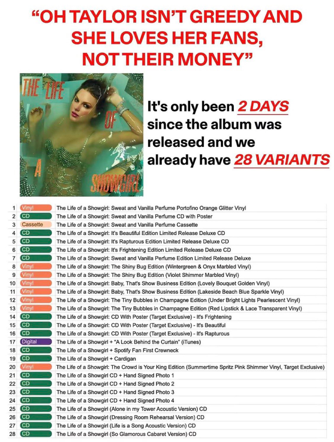 Yes, yes we’ve all heard about the variants. There are way too many, but whose fault is it if people are buying them? At least we can give Taylor credit for bringing back massive vinyl sales. If someone buys 25 different versions of a single album they are a stupid, stupid person. There’s nothing else to say.