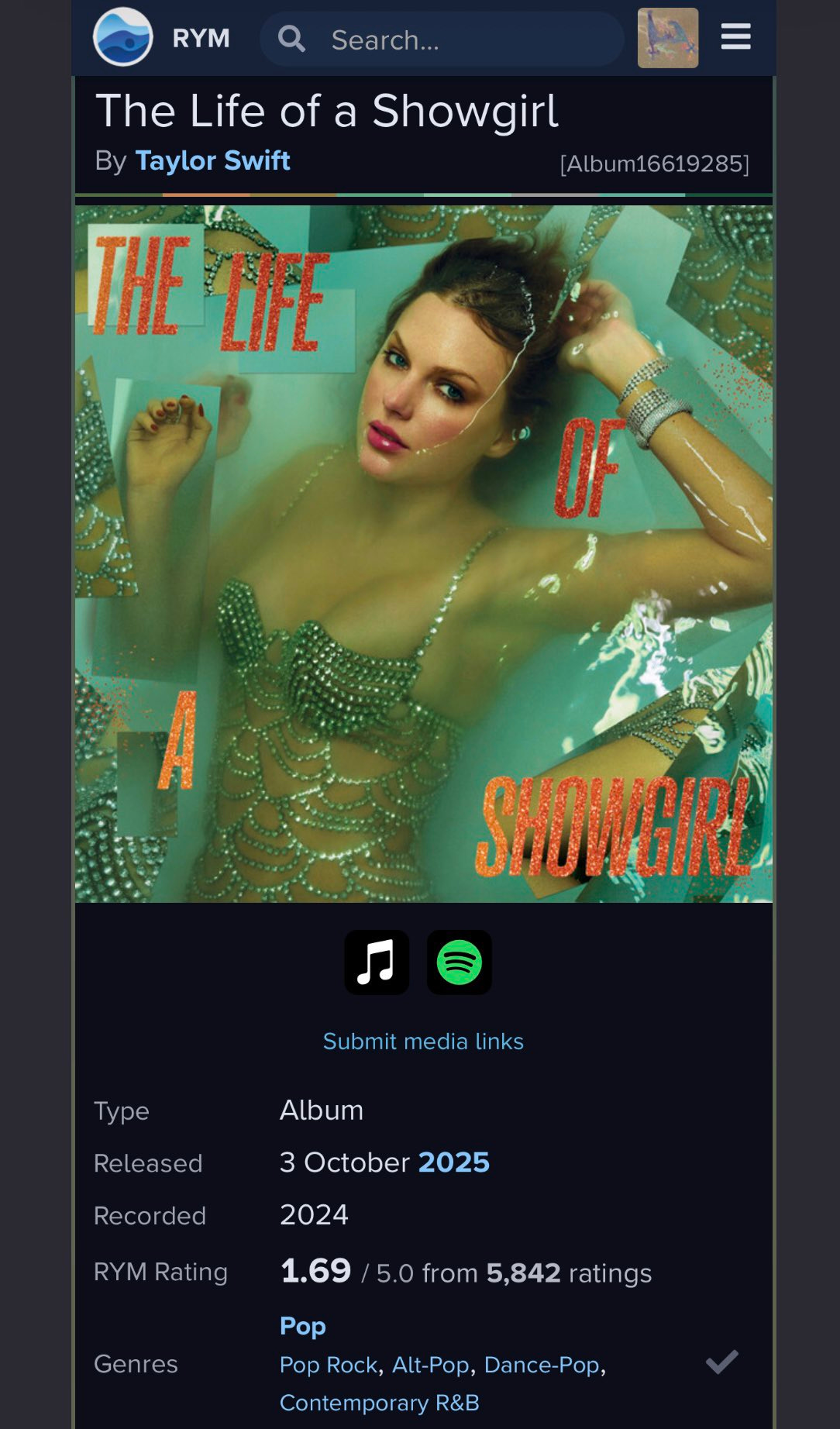 On RYM, where leaving reviews remained unrestricted, ‘Life of a Showgirl’ garnered a 1.69 rating out of 5 based on 5,842 reviews.